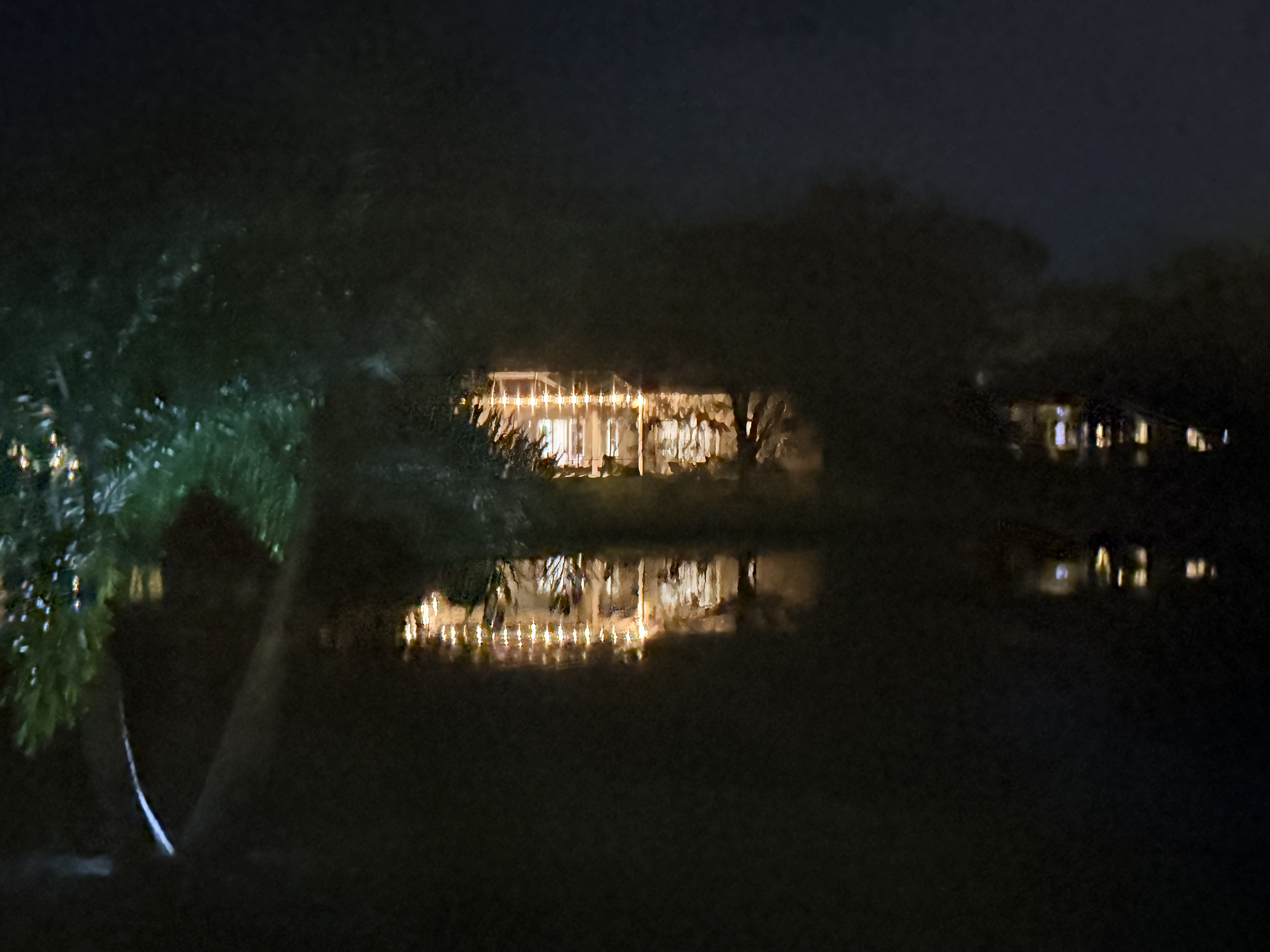 I spent time out on the lanai for a while after sunset taking in the scene across the lake. The dark lake was flat and reflected the lights of the houses on the far shore like an impressionist painting. The palms on the near shore provided some depth to the image.