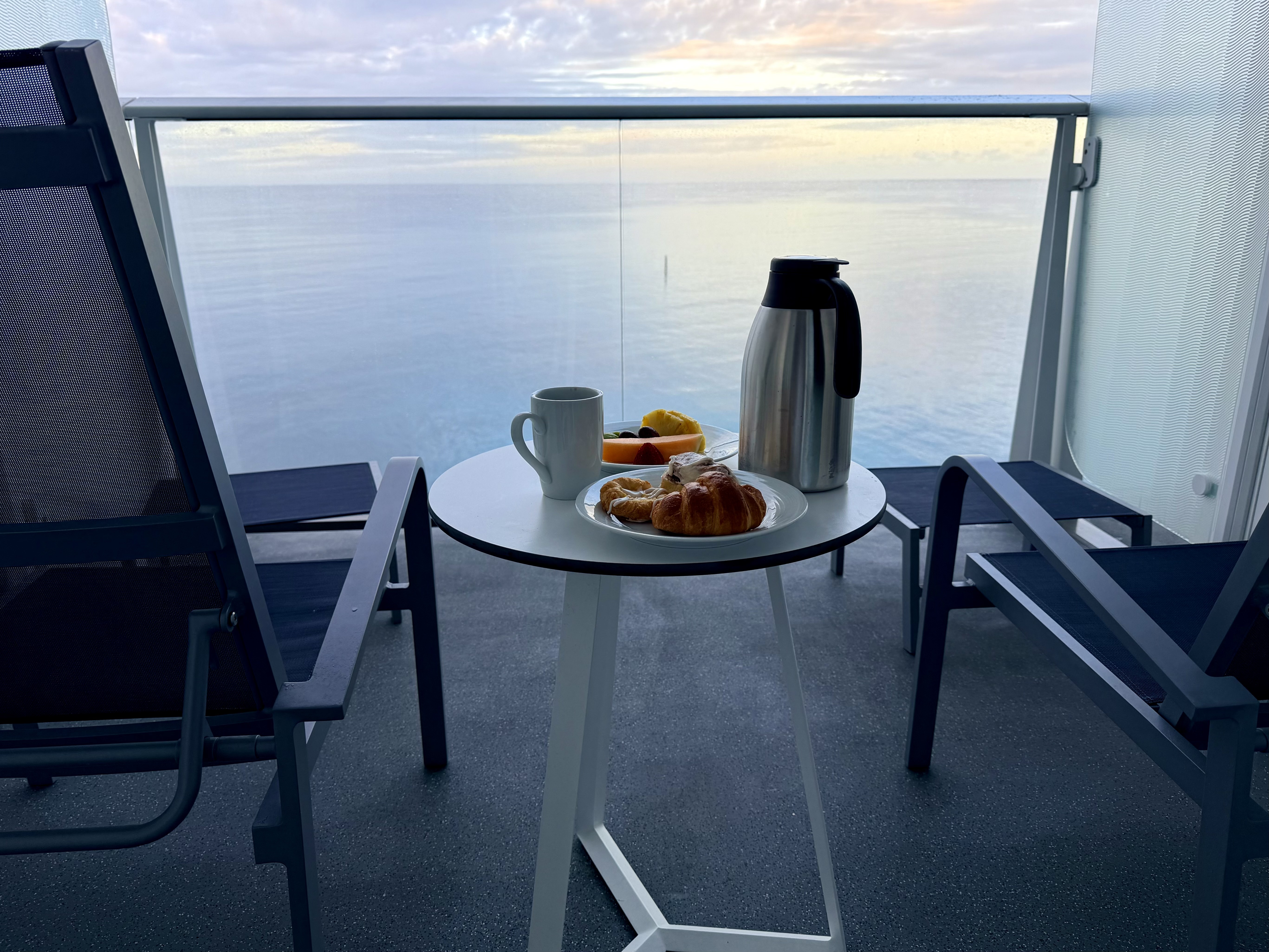 What I treasure most about cruising is the opportunity to savor breakfast on the veranda. Chris and I order coffee, fruit, and pastries delivered to our stateroom and, weather permitting, we relish breakfast while watching the sunrise, the ocean, or other captivating scene that graces our view.