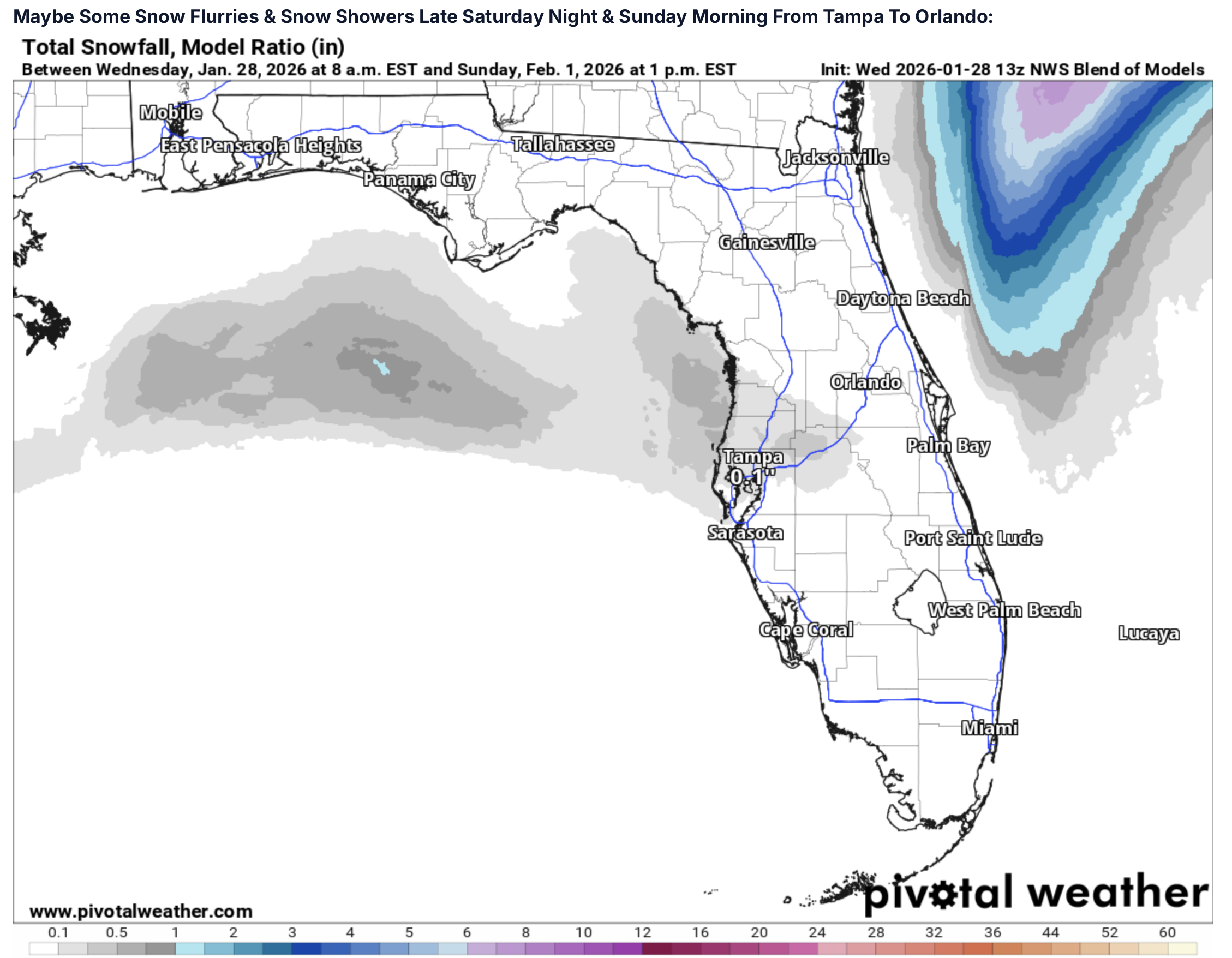 Chris and I are plotting to protect some of our sensitive plants.I included a map projecting potential snowfall from Tampa to Orlando. The forecasted snow is confined to western Florida. Floridians are not well prepared for the temperatures expected early Sunday morning. I have had to swap my usual short sleeve shirt and shorts with sandals for warmer attire. I realized that I don't enjoy wearing jeans and long sleeved shirts anymore.