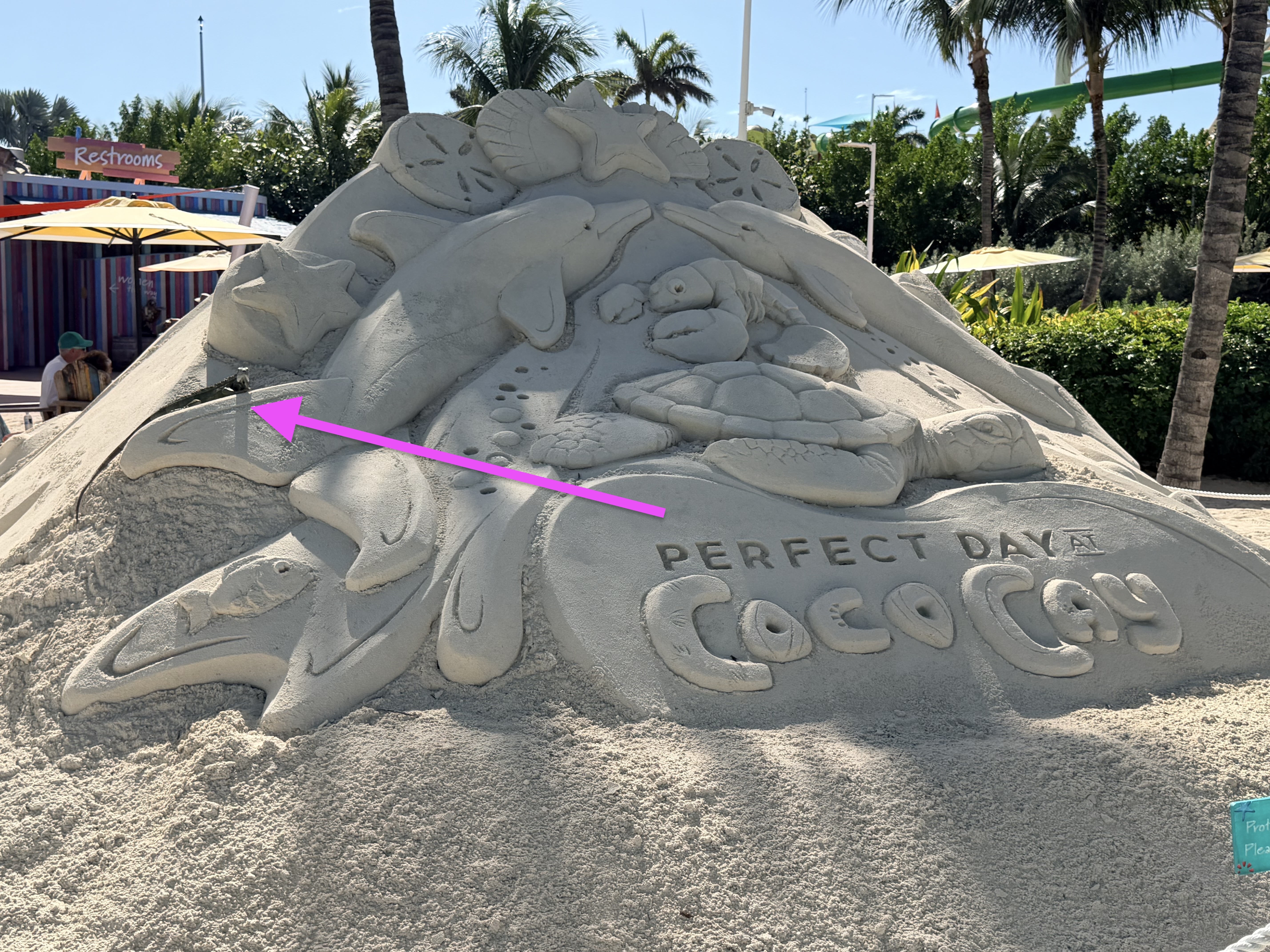 We were surprised last week when we were visiting CocoCay to see an iguana on the sand art welcoming people to the island. It was a bit humorous. What was even more amazing was the number of people who barely even noticed the lizard sitting in the sun on the sand art. Totally oblivious. I think it added something to the experience. I enjoyed seeing the iguana hanging out there just looking at all the people.